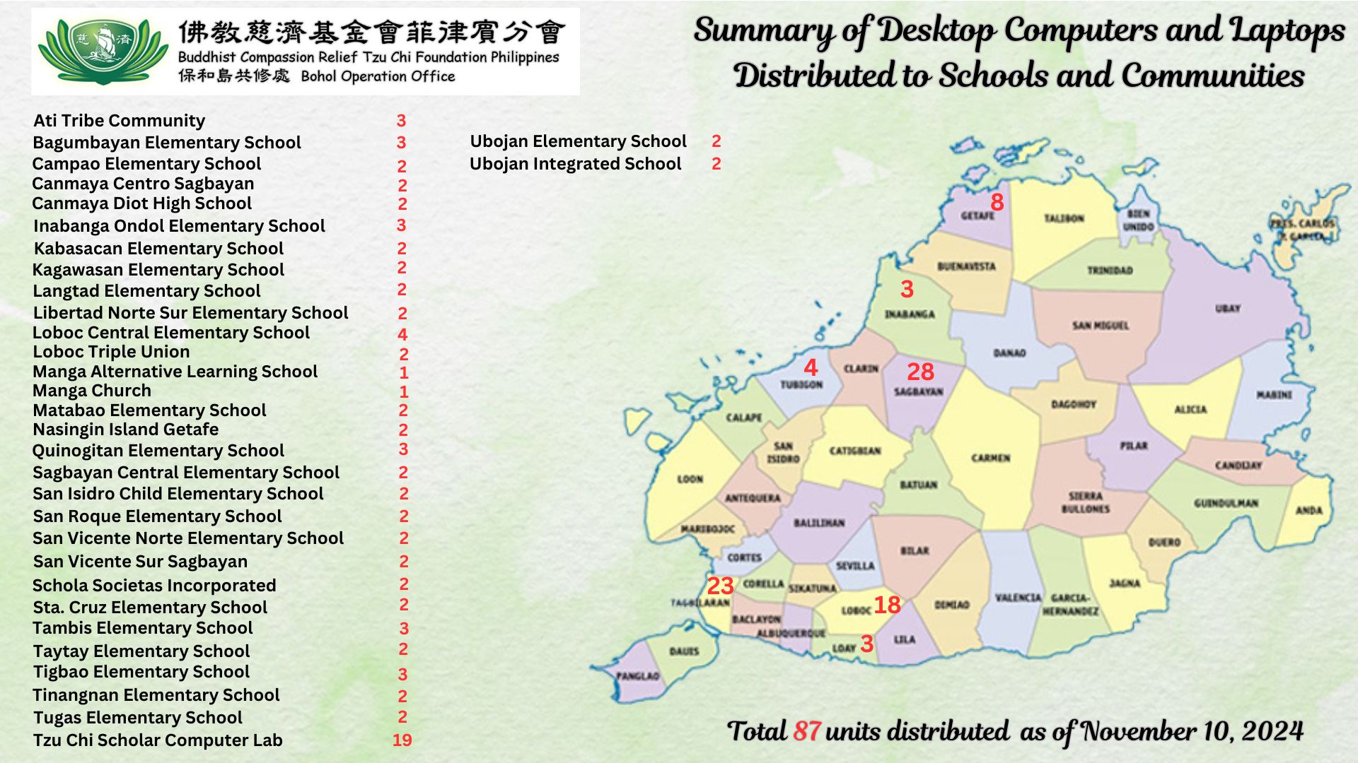 By November 13,2024, Brother Joe Chen has shipped out from Taiwan, 150 units of desktop computers and laptops including 60 units still making its way to Bohol, Philippines. As of November 10,2024, 87 computer units have been distributed to several public schools around the island province. While 19 units of these were set up in the Tzu Chi Bohol office as a resource hub for the Tzu Chi Scholars’ use with their school research and project works.