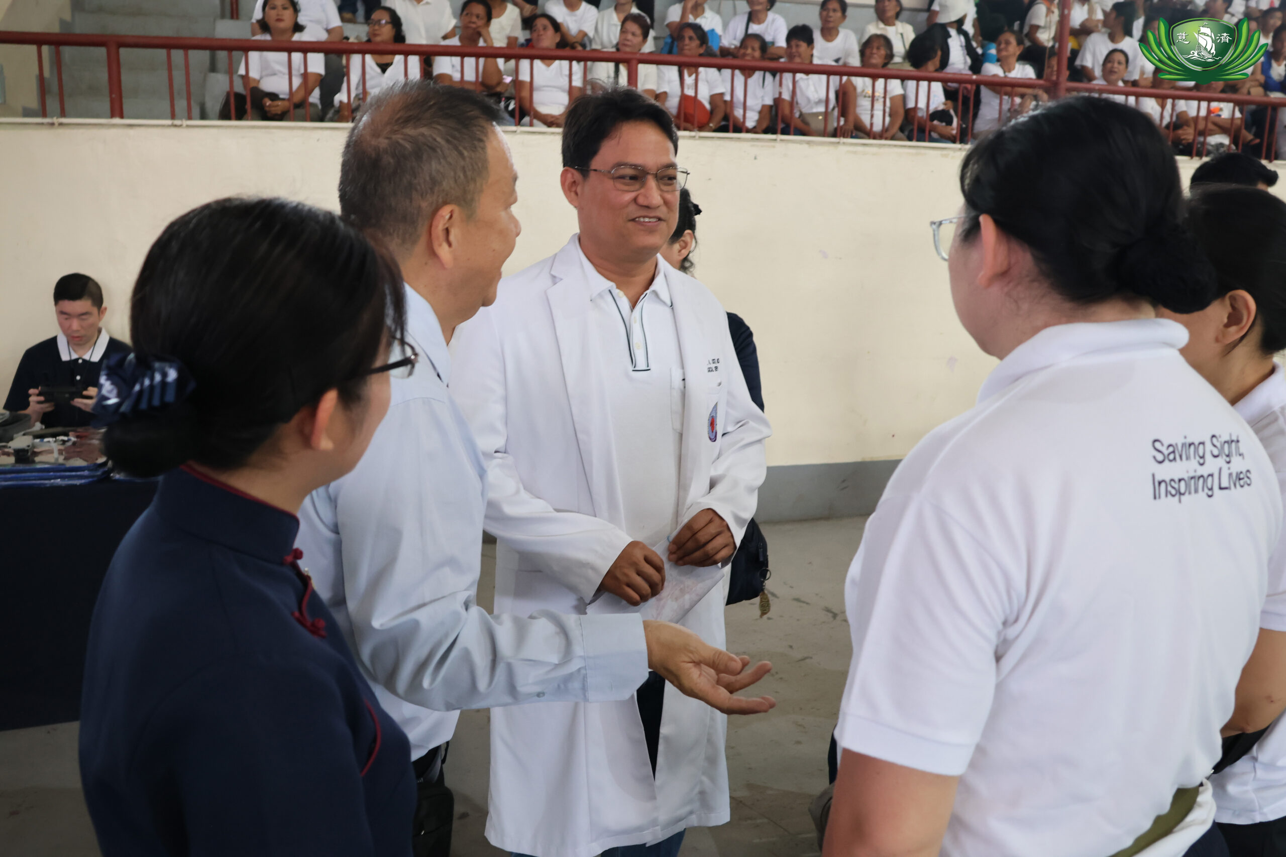 Tzu Chi volunteers warmly welcome Dr. John Rodel Acosta (in his white coat) upon arrival.